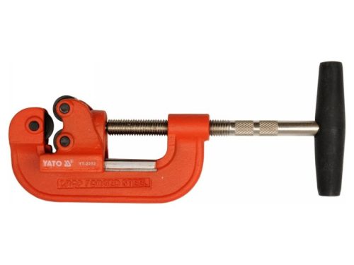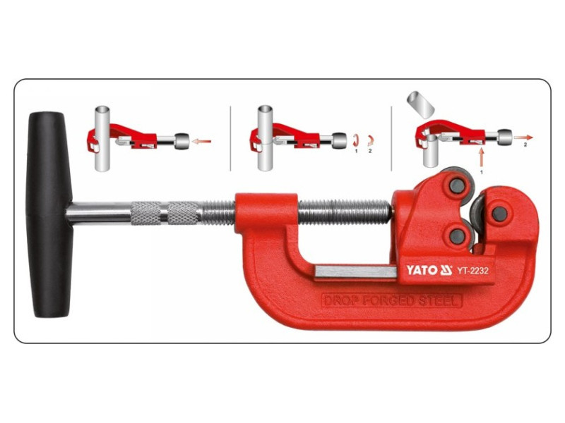 Csavaros nyomású hengervágó. Acél, réz, alumínium és műanyag csövek vágására alkalmas 10 és 40 mm között. a vágó két forgó nyomó görgővel rendelkezik a csövek jobb vezetéséhez a hengervágó, a megfelelően választott profilú pengével, csapágyacélból készül ez biztosítja a vágó nagyon hosszú élettartamát és a nagy precizitású vágást ráadásul a csavaros nyomásbeállítás lehetővé teszi a vágóerő pontos beállítását Cserélhető vágókerék is kapható a vágóhoz: termékkód YT-22314. Használati figyelmeztetések: Figyelem! Munka közben mindig használjon személyes védőfelszerelést.