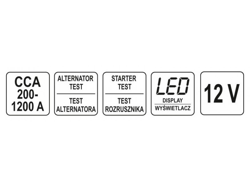 Lehetővé teszi a 12-voltos akkumulátorok tesztelését autókban, furgonokban és motorkerékpárokon, valamint az indítórendszer értékelését.Tervezve hagyományos ólom-savas akkumulátorok (úgynevezett nedves), gél és AGM akkumulátorok teszteléséretovábbi funkciók az akkumulátor állapotának értékelésére (fogyasztás százalékban) és töltöttségi állapotának (névleges kapacitás százalékban) megállapításáraCCA teszt tartomány: 200-1200jól olvasható LCD kijelző fényerő beállítássaltápellátás közvetlenül a jármű szerelvényéről, így az eszköz mindig munkakész