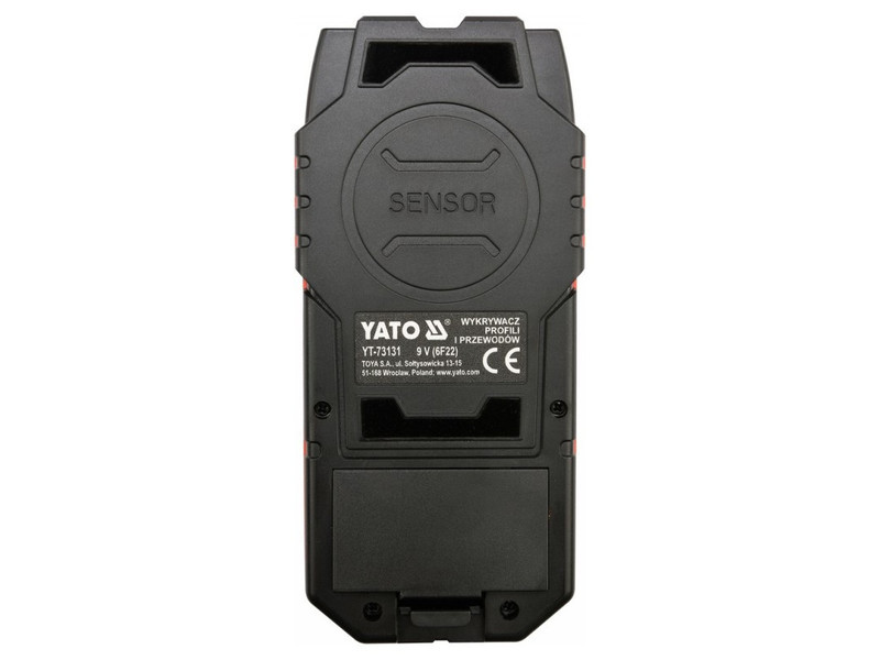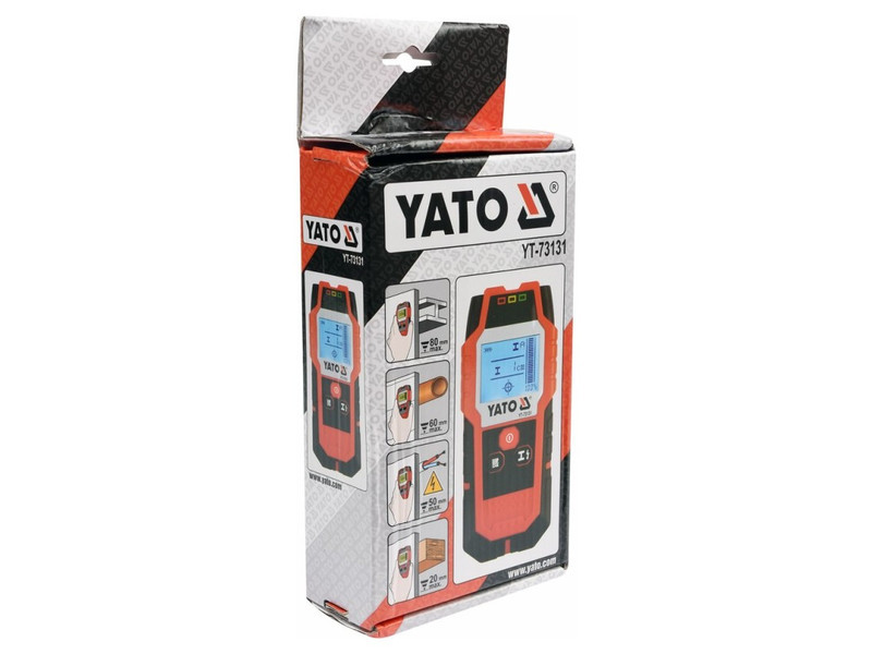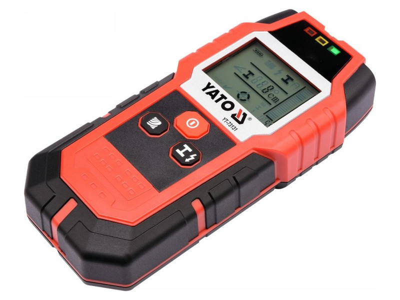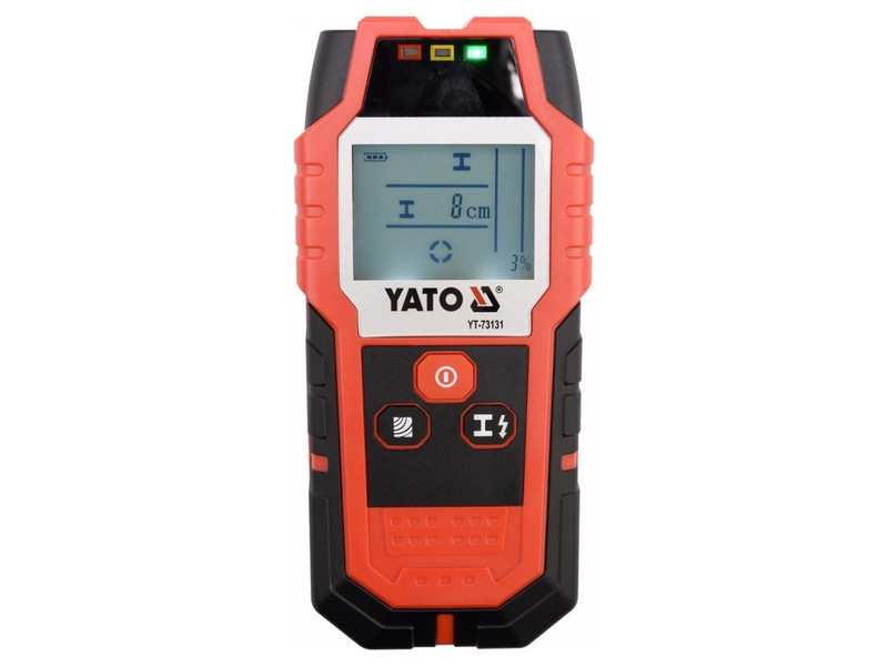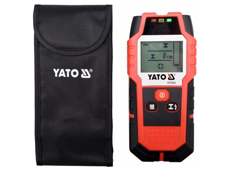 A YT-73131 professzionális vezeték- és profilérzékelő lehetővé teszi a következők észlelését falakban vagy gipszkartonban:életben lévő vezetők akár 50 mm-ig.ferromágneses fémek akár 80 mm-ignem-ferromágneses fémek (pl. rézcső) akár 60 mm-igfába szerelt szerkezeti elemek akár 20 mm-ig.A YATO YT-73131 profilérzékelő használata jelentősen felgyorsítja a munkát, növeli a biztonságot és minimalizálja az elektromos vagy vízvezeték rendszerek véletlen sérülésének kockázatát, amelyek a vakolat alatt helyezkednek el. Segítségével többek között biztonságosan fúrhatunk lyukat, vagy megtalálhatjuk a helyet, ahol a gipszkarton alatt rejtőző fa- vagy fémszerkezetbe csavarozhatunk. Segít szintén a technikai dokumentáció elkészítésében is. A nagy és világos kijelző, LED háttérvilágítással, tájékoztatást ad:a kiválasztott funkcióróla jel erősségéről [%]a keresett fémelem távolságáról [cm]a középponti helyzetéről az érzékelőhöz képestTovábbi funkciók és jellemzők:hangjelzés és három jelzőfény, zöld/narancs/piros színben, melyek további jelzést adnak a keresett anyag észleléséről.életben lévő vezetékek észlelési erősségének szabályozhatóságaautomatikus kikapcsolás 5 percnyi inaktivitás utánaz érzékelő alján lágy anyagból készült betétek találhatók, melyek érintkeznek a felülettel a ház karcolásának megakadályozása érdekében.a készülékhez tartozó tok erős anyagból készült.