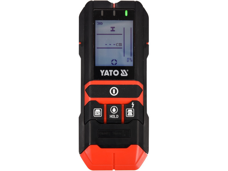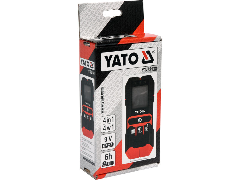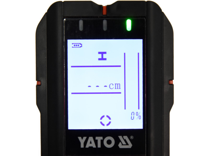 Professzionális vezeték, profil és nedvességmérő detektor egyben. A YT-73138 lehetővé teszi a következők észlelését falakban vagy gipszkartonban: beüzemelt vezetékek 50 mm-ig ferromágneses fémek 120 mm-ig nem-ferromágneses fémek (pl. rézcsövek) maximum 80 mm-ig fa szerkezeti elemek pontosan maximum 20 mm-ig, durván maximum 38 mm-ig A beépített nedvességmérő a fa és az építőanyagok számára lehetővé teszi: a mérést maximum 8 mm mélységig a fa nedvességtartalmának mérését a 5-50% tartományban az építőanyagok nedvességtartalmának mérését a 1,5-33% tartományban A YATO YT-73138 4 az 1-ben detektor és mérő használata jelentősen felgyorsítja a munkát, növeli a biztonságot és minimalizálja a vakolat alatt elhelyezkedő elektromos vagy vízvezeték rendszerek véletlenszerű károsodásának kockázatát. Ennek köszönhetően többek között biztonságosan fúrhat lyukat, vagy megtalálhatja a helyet, ahol egy csavart be lehet csavarni egy vakolatlap alatt rejtőző fa- vagy fémprofilba. A beépített nedvességmérő lehetővé teszi többek között a hőhidakban lévő vakolat nedvességtartalmának megállapítását, valamint a tüzifa nedvességtartalmának ellenőrzését. A nagy és könnyen olvasható kijelző, LED háttérvilágítással, tájékoztat bennünket a következőkről: a kiválasztott funkcióról a jel erősségéről [%] a keresett fémelem távolságáról [cm] a központi elhelyezkedésről a szenzorhoz képest További jellemzők és funkciók: hangjelzés és három jelzőfény (zöld / narancs / piros), amely tovább jelzi a keresett anyag észlelését. beállítható detektálási erősség a beüzemelt vezetékek és fém alkatrészek számára automatikus kikapcsolás 5 percnyi inaktivitás után a detektor alján puha anyagból készült betétek találhatók, amelyek megvédik a házat a karcolásoktól a felülettel érintkezve. a készülék tokja strapabíró anyagból készült