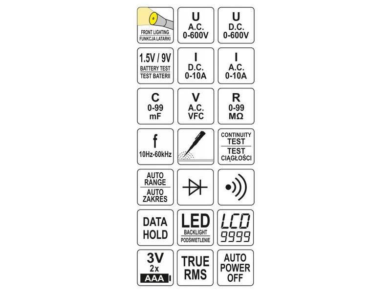 A YT-73094 univerzális mérő TRUE RMS funkcióval és automatikus tartománnyal minden méréshez lehetővé teszi az alap- és speciális villamos mérések elvégzését. További hasznos opció az érintkezés nélküli váltófeszültség érzékelése, valamint a fázisvezeték érzékelése az szigetelésen keresztül. A 1,5V és 9V-os akkumulátorteszt segítségével terhelés alatt ellenőrizhetjük az akkumulátor feszültségét, ez segít annak állapotának felmérésében és kizárni vagy megerősíteni a cserének szükségességét.