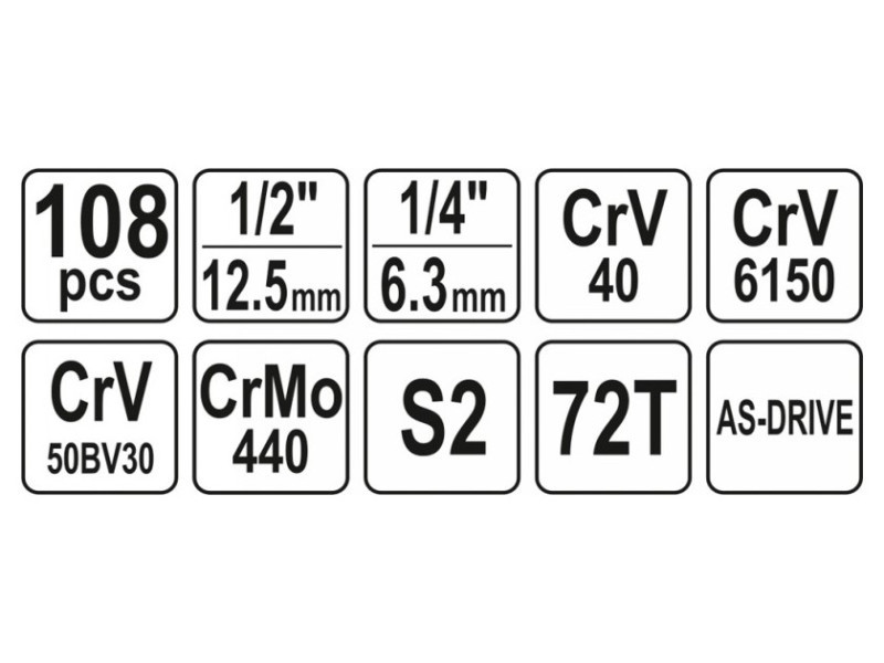 Ez egy professzionális szerszámkészlet, amelyet szakosodott autó- és gépszerelő szolgáltatások igényeire fejlesztettek ki. A csillagkulcsokat és az alkalmazás hajtását tartós, szerszámvadácium acélból, CRV 50BV3-ból készítették. Az alkalmazásokat a mátrix módszerrel készítették, és a keményítési folyamat előtt pontos illesztéssel és ellenőrző eszközökkel kalibrálták. Az AS-Drive rendszerrel felszerelt alkalmazások, amelyek növelik a maximális pillanatot 25%-kal, teljes védelemmel a sapkák forgácsolója számára, az alkalmazás kéttonás felületkivitelben. A készletben találhatók még a kemény S2 acélból készült bitek. A készlet munkát tesz lehetővé, amely nagyon magas terhelést és pontosságot igényel, lehetővé teszi számos szerviztevékenység elvégzését, amelyek az különböző névleges méretű menetes kapcsolatok ki- és becsavarásával kapcsolatosak.