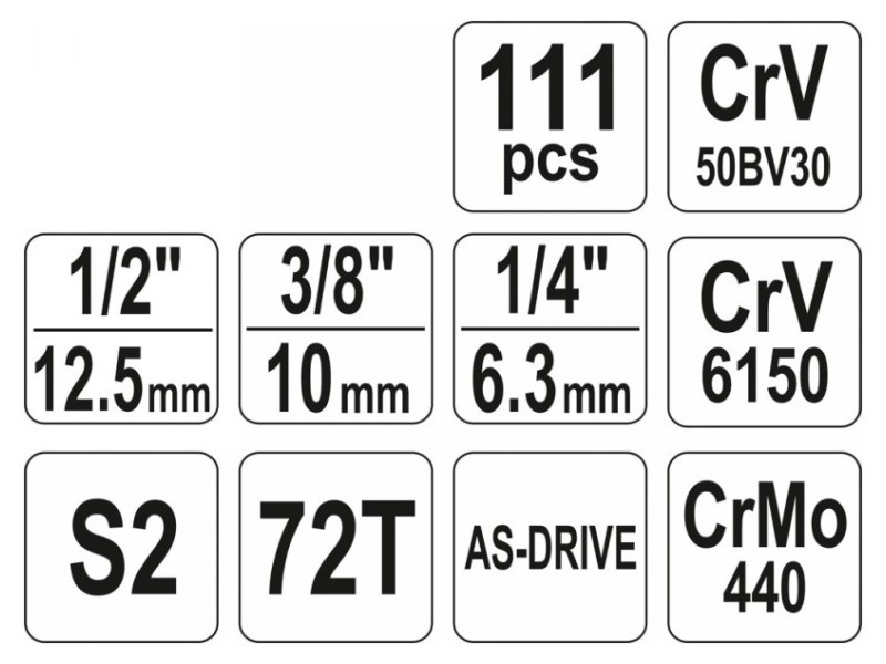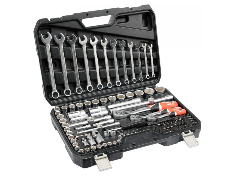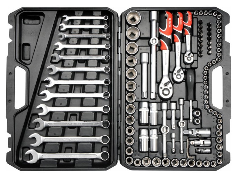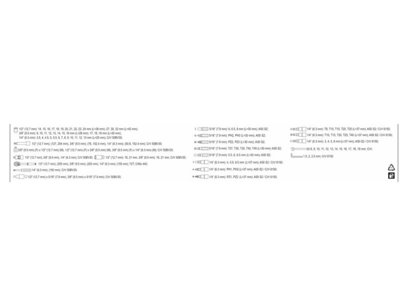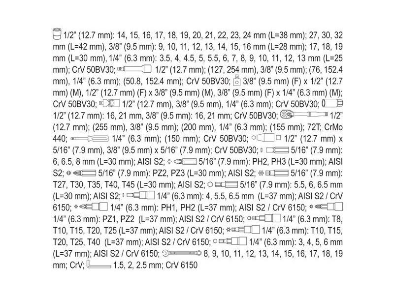 Egy szakmai szerszámkészlet, amelyet autós és mechanikai szolgáltatások igényeihez fejlesztettek ki. A dugókulcsokat, valamint a felhelyezés rögzítését, tartós szerszámacélból készítették. A felhelyezéseket a mátrix módszerrel készítették, és a keményítési folyamat előtt precíz illesztésekkel és ellenőrző eszközökkel kalibrálták. A felhelyezések az AS-Drive rendszerrel vannak felszerelve, ami 25%-kal növeli a maximális pillanatot, teljes védelemmel a sapkák vágója számára. A készlet tartalmaz S2 acélból készült biteket is. A készlet lehetővé teszi a nagyon nagy terhelést és precizitást igénylő munkát, lehetővé teszi számos szerviztevékenység elvégzését, amelyek a különböző névleges méretű csavaros kapcsolatok kicsavarásával és becsavarásával kapcsolatosak. A racsnik háromszög alakú fogantyúval és 72 fogúak (5 fokos munkaütem). Dugókulcs 1/2 ": 14; 15; 16; 17; 18; 20; 21; 22; 23; 24 mm, L = 38 mm; 30; 30; 32 mm, l = 42 mm dugókulcs 3/8" : 9; 10; 11; 12; 13; 14; 15; 16 mm, l = 28 mm 17; 18; 19 mm, L = 30 mm 1/4 ": 3.5; 4; 4.5; 5; 5.5; 6; 7; 8; 9; 10; 11; 12; 13 mm, l = 25 mm racsni 1/2": 72T, 255 mm racsni 3/8 ": 72t, 200 mm racsni 1/4": 72t, 155 mm csúszó gomb 1/4 ", csavarhúzó 1/4", L = 150 mm hosszabbítók 1/2 ": 125 mm ; 250 mm 3/8 "hosszabbítók: 575 mm; 150 mm hosszabbítók 1/4 ": 50 mm; 100 mm átalakítók: 1/4"; 3/8 ""; 1/2 "" gyertya dugókulcsok 1/2 "; 3/8": 16; 21 mm Cardan csukló: 1/2 "; 3/8" és 1/4 "Bitts 5/16" adapter 1/2 "bitekkel 5/16": - TORX: T27; T30; T35; T40; T45 - Kereszt Philips: PH32; PH3 - Kereszt -Cross: PZ2; PZ3 - lapos: 6; 6.5; 8 mm - hatoldalú mágnes: 5.5; 6; 6.5 mm Torx csavarhúzó a 1/4 "felhelyezéshez: T8; T10; T15; T20; T25 TORX csavarhúzó lyukkal a sapkán 1/4": T10; T15; T20; T25; T40 Philips csavarhúzó a 1/4 "felhelyezéshez: PH1; PH2 Kereszt -csavartippek a PoziDRIV-on a 1/4" felhelyezéshez: PZ1; PZ2 lapos csavarhúzó a 1/4 "felhelyezéshez: 4; 5.5; 7 mm hatszögletű csavarhúzó a 1/4" felhelyezéshez: 3; 4; 5; 6 mm lapos kulcsok: 8; 10; 11; 12; 13; 14; 15; 17; 19 mm Imbuszkulcsok: 1.5; 2; 2.5 mm bőrönd