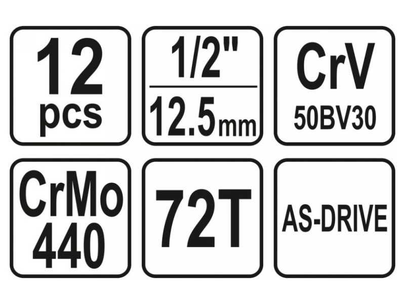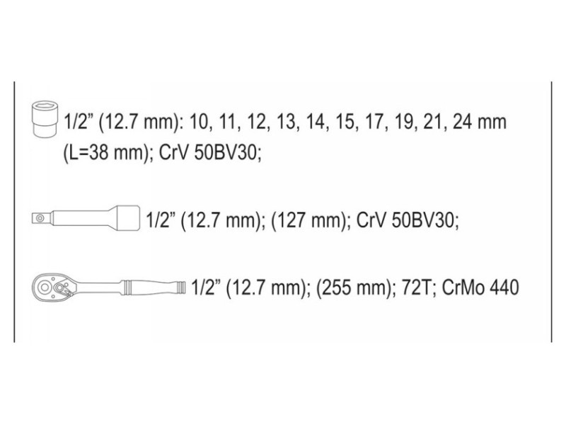Professzionális szerszámkészlet, amelyet a specializált autós és mechanikai szolgáltatások igényeire fejlesztettek ki. A fogaskerekes kulcsokat és a tartózék hajtását tartós, szerszámvánádium-acélból készítették, CRV 50BV3. Az AS-Drive rendszerrel felszerelt tartozékok növelik a maximális pillanatot 25%-kal, teljes védelemben a kupak vágója, a kéttonnás felülettel rendelkező tartozék. A tartozékokat a mátrix módszerrel készítették, a hőkezelési folyamat előtt pedig pontos illesztésekkel és ellenőrző berendezésekkel kalibrálták. A készlet lehetővé teszi a nagyon nagy terhelést igénylő és precíz munkát, lehetővé teszi számos szerviztevékenység végrehajtását, amelyek a különféle névleges méretű menetes kapcsolatok ki- és becsavarásával kapcsolatosak. A racsni háromszög alakú fogantyúval és 72 foggal rendelkezik (munkaugrás 5 fok). 1/2 "tartozékok: 10; 11; 12; 13; 14; 17; 19; 21; 24 mm, L = 38 mm racsni: 1/2", 72t, 255 mm toldó 1/2 ": 125 mm Bőrönd