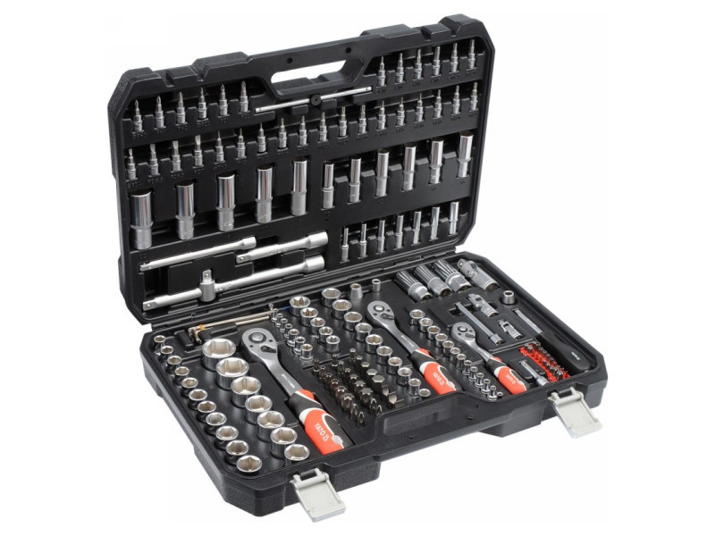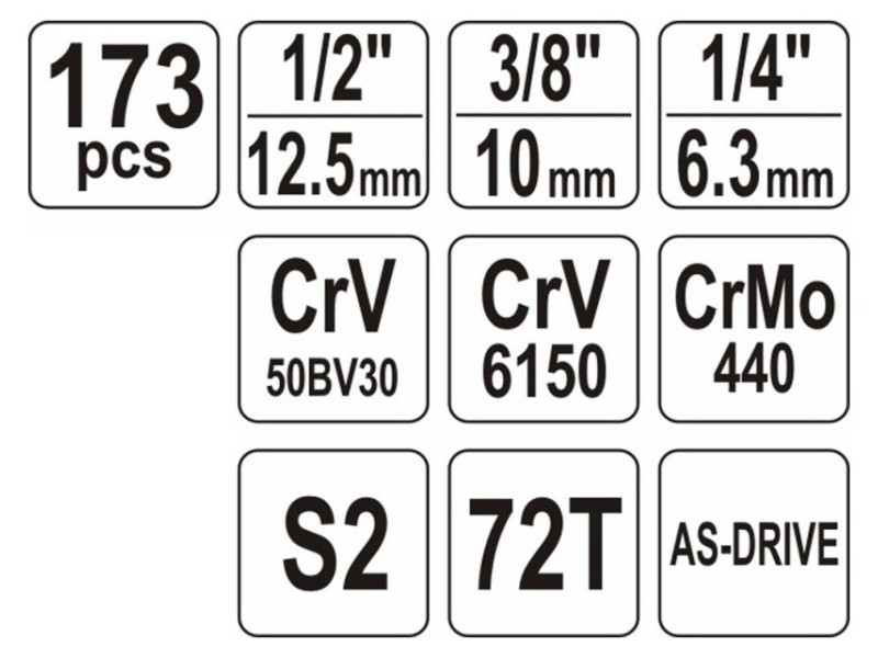 Professzionális szerszámkészlet, amelyet autós és mechanikai szakemberek igényeihez fejlesztettek ki. A dugókulcsok és a tartó meghajtója tartós szerszámvánádium acélból CRV 50BV3 készült. A tartozékokat mátrix módszerrel készítették, a keményítési folyamat előtt pedig precíz illesztésekkel és ellenőrző eszközökkel kalibrálták. Az AS-Drive rendszerrel felszerelt tartozékok a maximális pillanatot 25%-kal növelik, teljes védelemmel a sapka vágója ellen, a két tónusú felületkezeléssel ellátott tartó. A készlet tartalmazza a kemény S2 acélból készült biteket is. A készlet nagyon nagy terhelést és precizitást igénylő munkavégzést tesz lehetővé, lehetővé teszi számos szerviztevékenység elvégzését, amelyek csavarozási és csavarhúzási kapcsolatokkal kapcsolatosak különböző névleges méretekben. A racsnik háromszögletű fogantyúval és 72 fogakkal (5 fokos munkaütem) rendelkeznek. 1/2 "tartozékok: 10; 11; 12; 13; 14; 17; 19; 20; 21; 22; 24 mm, l = 38 mm; 30; 30; 32 mm, l = 42 mm hosszú tartozékok 1 /2 ": 16; 17; 18; 19; 22 mm, L = 76 mm 1/2 "Torx: E18; E20; E24 sapkák 3/8": 10; 11; 12; 13; 14; 15; 16; 17; 18; 19 mm hosszú 3/8 ": 10; 11; 12; 13; 14; 15 mm, L = 63 mm 3/8" Torx: E10; E11; E12; E14; E16 sapkák 1/4 ": 4; 4.5; 5; 5.5; 6; 7; 8; 9; 10; 11; 12; 13; 14 mm hosszú sapkák 1/4": 4; 5; 6; 7; 8; 9; 10 mm, L = 50 mm 1/4 "Torx: E4; E5; E6; E7; E8 Brzechotka 1/2": 72t, L = 255 mm racsni 3/8 ": 72t, 200 mm racsni 1/4" : 72T, 155 mm Csúszó gomb: 1/2 "; 1/4" 1/4 csavar gomb, L = 150 mm toldók 1/2 ": 125 mm; 250 mm 3/8 "toldók: 150 mm toldók 1/4": 50 mm; 100 mm gyertya sapkák 1/2 ": 16; 21 mm 3/8 gyertya tartó: 18 mm Cardan csukló: 1/2"; 3/8 ", 1/4" Bitts bithez 5/16 "1 /2 "Adapter bithez 5/16" 3/8 "1/4" bitt adapter 1/4 "négyzet bitt 5/16": 24 db 1/4 ": T8; T9; T10; T15; T20; T25; T27; T30 TORX csavarhúzó lyukkal a 1/4 "tartóban: T8; T9; T10; T15; T20; T25; T27; T30 Philips csavarhúzók a 1/4"-ban: PH0; Ph1; PH2 Kereszt -csavarhegyek a Pozidriv-on a 1/4 "tartóban: PZ0; PZ1; PZ2 Lapos csavarhúzó a 1/4" tartóban: 4; 5.5; 6.5; 7 mm Sześni -fejű csavarhúzó a 1/4 "-ban: 3; 4; 5; 6 mm Imbuszkulcsok: 1.25; 1.5; 2; 2.5; 3; 4; 5 mm bőrönd
