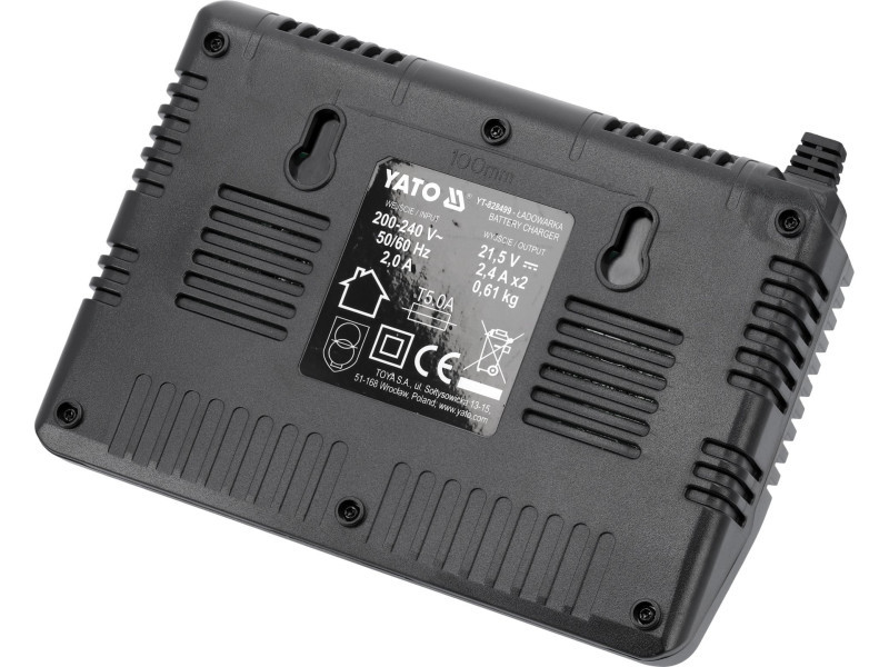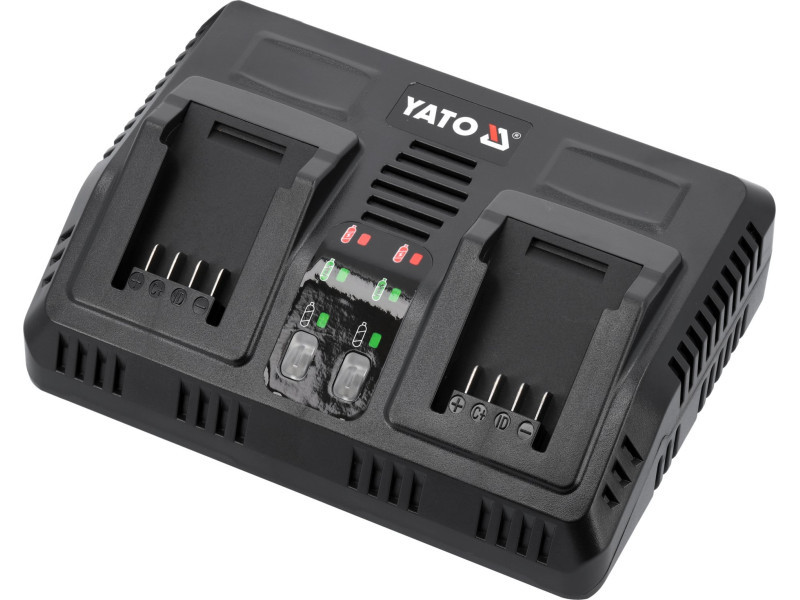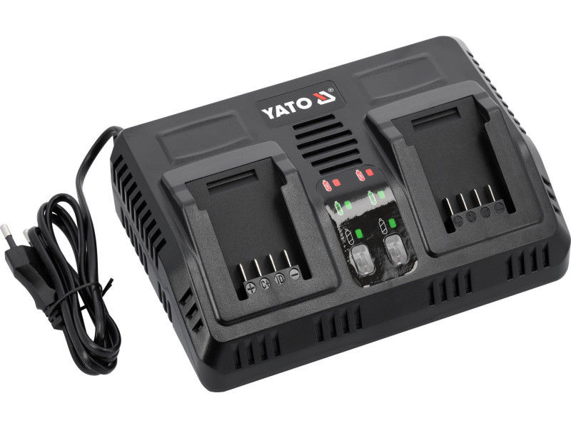 Dupla töltő minden YATO 18-voltos rendszerű akkumulátorhoz. Egyszerre és külön-külön is képes tölti a két akkumulátort. A beépített akkumulátor teljesítmény- és hőmérséklet-ellenőrző rendszer gondoskodik az akkumulátor élettartamáról. Túlmelegedett cellák esetén nem kezd el tölteni. Negatív hőmérsékleten tárolt akkumulátor esetén, az akkumulátor töltését akkor kezdi meg, amikor az akkumulátor hőmérséklete meghaladja a +5 Celsius-fokot.