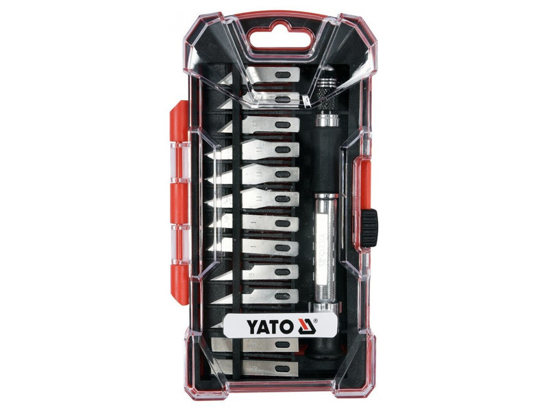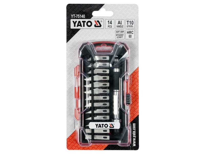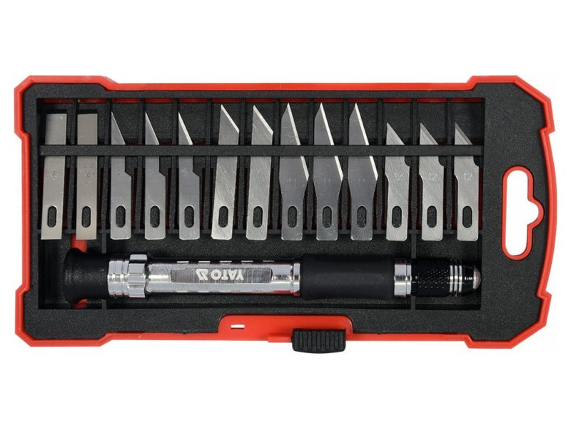 14 darabos precíziós késkészlet. a készletben 13 penge található, melyek T10 acélból készültek, és rendkívül magas, HRC 60 keménységgel rendelkeznek ez garantálja a pengék rendkívüli élességét és tartósságát a nyél alumíniumból készült, és van rajta egy gumi borítás és forgatható csúcs, ami kényelmet biztosít a munka során a precíziós kések egy nagyon tartós dobozban vannak csomagolva, melynek fedele PC - nagyon ütésálló . Használati figyelmeztetések: Figyelem! Mindig használjon személyes védőeszközöket a munka során.