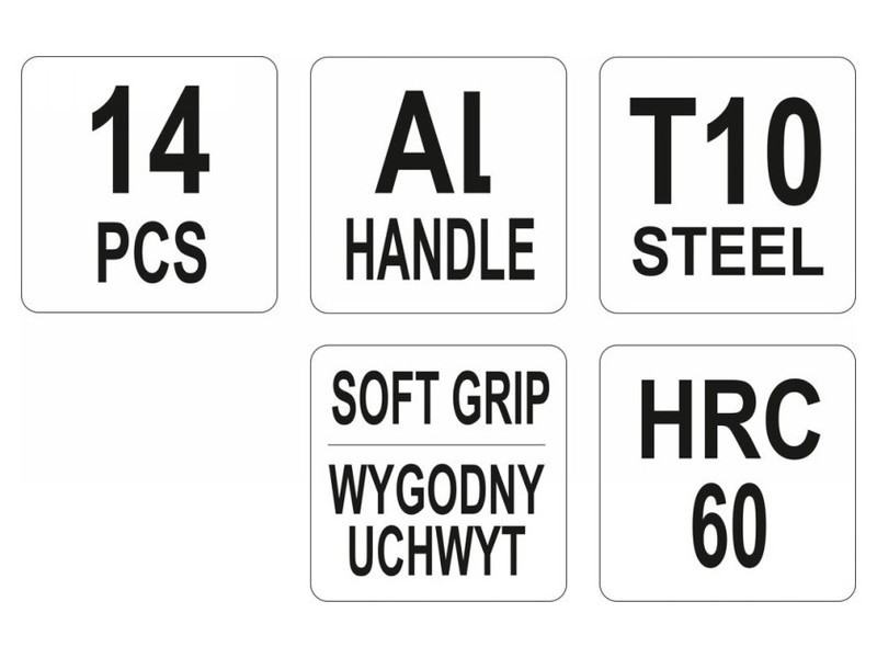 • a készletben 13 penge található, melyek T10 acélból készültek, és rendkívül magas, HRC 60 keménységgel rendelkeznek
