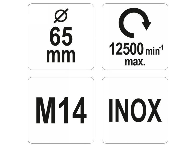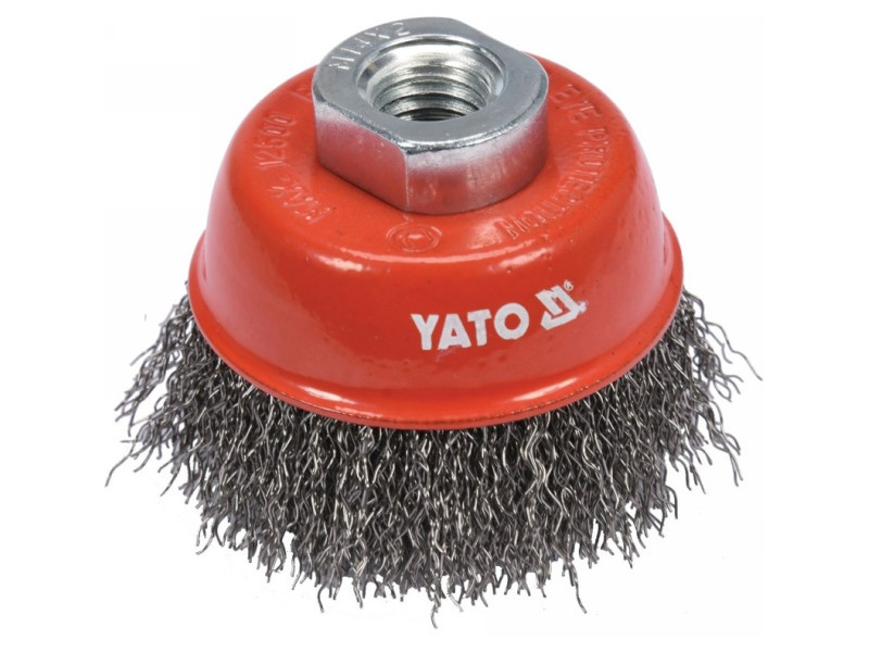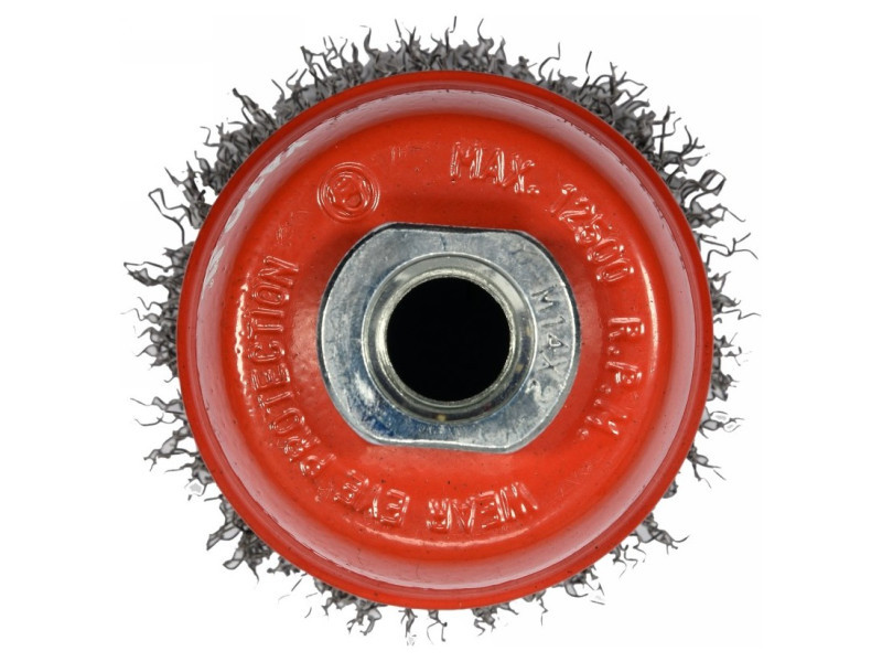 Egy sarokkefe, amelyet fémfelületek, festékbevonatok tisztítására és polírozására, rozsdaeltávolításra és szerszámok tisztítására terveztek, csiszológép használatával.kiváló minőségű anyagokból készülthatékony és tartósa drótrögzítés acélgyűrűkkel erősített./ul>nagy darabok rozsda, hegesztési varrat és mérleg eltávolítására tervezettinox acélból készült sodrott drótkefe átmérője: 65 mmM14 menetmax. fordulatszám: 12500 rpm Használati figyelmeztetések: Figyelem! Mindig használjon személyes védőfelszerelést munka közben.