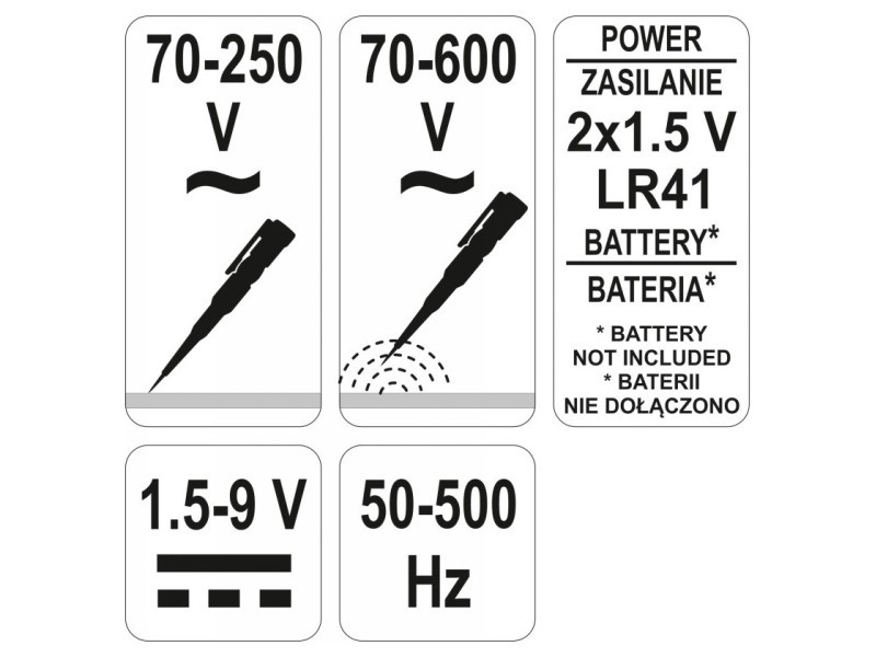 A YT-2864 feszültségmonitor lehetővé teszi az AC feszültség érzékelését, például egy háztartási aljzatban vagy a drótok végén, két módszerrel: érintkezési és indukciós. A készülék lehetővé teszi a felhasználó számára a kábel folytonossági tesztjét és az akkumulátorok vagy újratölthető akkumulátorok állapotának ellenőrzését. A feszültség jelenlétét az a LED jelzi, amely a fogantyú belsejében található.A PRÓBNIK FUNKCIÓIAC feszültség érzékelési tartománya érintkezéses módszerrel: 70 - 250VAC feszültség érzékelési tartománya indukciós módszerrel: 70 - 600Vakkumulátor érzékelési tartománya érintkezéses módszerrel: 1.5 - 9Vkábel folytonossági teszt érintkezéses módszerrel: 0 - 50 M? MŰSZAKI ADATOKteljes hossz: 140 mmpengeszélesség: 3.5 mmtápellátás: 2x1.5V; LR41ÉRINTKEZÉSI MÓDSZERIllessze a nyílhegyet az áram alatt lévő áramkörhöz. A LED világítása jelzi az elektromos áram áramlását ezen az elemen. Ezzel a módszerrel nem ajánlott megérinteni a fogantyú tetején található érintkezőt. Az érintkező megérintése nem okoz elektromos sokk veszélyt, de növeli a próbnik érzékenységét, és hamis jelet adhat.Index MódszerA módszer lehetővé teszi az AC feszültség érzékelését egy szigetelt dróton. Ehhez fogja meg a próbát a penge szigetelt részénél és közelítse a fogantyú tetején található érintkezőt a szigetelt dróthoz. Amikor a LED világít, azt jelenti, hogy a vizsgált drót éles. A módszer érzékenységét növelheti, ha a próbát a penge szigetelt részétől fogva fogja meg. Ez a módszer lehetővé teszi a „kontaktus nélküli” törés érzékelését egy éles elektromos dróton. A törés helyén a próba abbahagyja a feszültség jelenlétének jelzését.AKKUMULÁTOROK ÁLLAPOTÁNAK ELLENŐRZÉSEA próba lehetővé teszi akkumulátorok vagy újratölthető akkumulátorok állapotának ellenőrzését, amelyek különböző elektromos eszközök működtetésére szolgálnak, 1.5V-tól 9V-ig. Illessze a próba pengéjét a „+” jelű akkumulátor pólushoz, érintse meg a fogantyú tetején található érintkezőt, majd érintse meg a „-” jelű akkumulátor pólust. Amikor a LED világít, azt jelenti, hogy az akkumulátor vagy az akkumulátor csomag feltöltött. Ne használja ezt a módszert magasabb feszültségértékel rendelkező akkumulátorok vagy újratölthető akkumulátorok tesztelésére. Ne teszteljen akkumulátorokat vagy akkumulátorokat, amelyek egy elektromos áramkörhöz vannak csatlakoztatva.KÁBEL FOLYTONOSSÁGÁNAK ELLENŐRZÉSEEllenőrizze a drót folytonosságát úgy, hogy a hegyet a drót egyik végére illeszti, majd amíg a fogantyú tetején található érintkezőt tartja, fogja meg a drót másik végét. A LED világítása jelzi a vizsgált drót folytonosságát. Tilos ezzel a módszerrel ellenőrizni az áram alatt lévő drótok folytonosságát egy elektromos áramkörben.