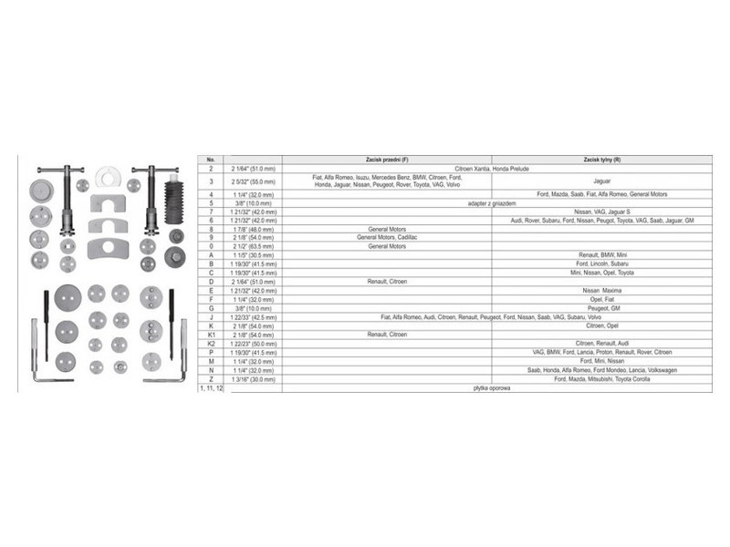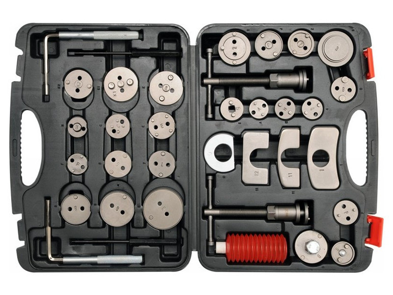 Professzionális féknyereg-szeparátor készlet. A készülék két csavarprésszel - jobb és bal kézre - és egy a legtöbb autómodellhez igazodó lemez készlettel rendelkezik. A készlet 35 elemet tartalmaz. Az egészet egy masszív bőröndben helyezték el.