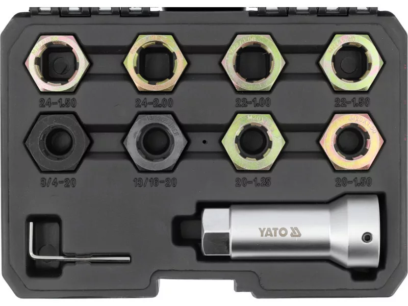 Professzionális 10 darabos készlet, karosszéria tengely menetek javításához. A készlet egy praktikus tokban van csomagolva.