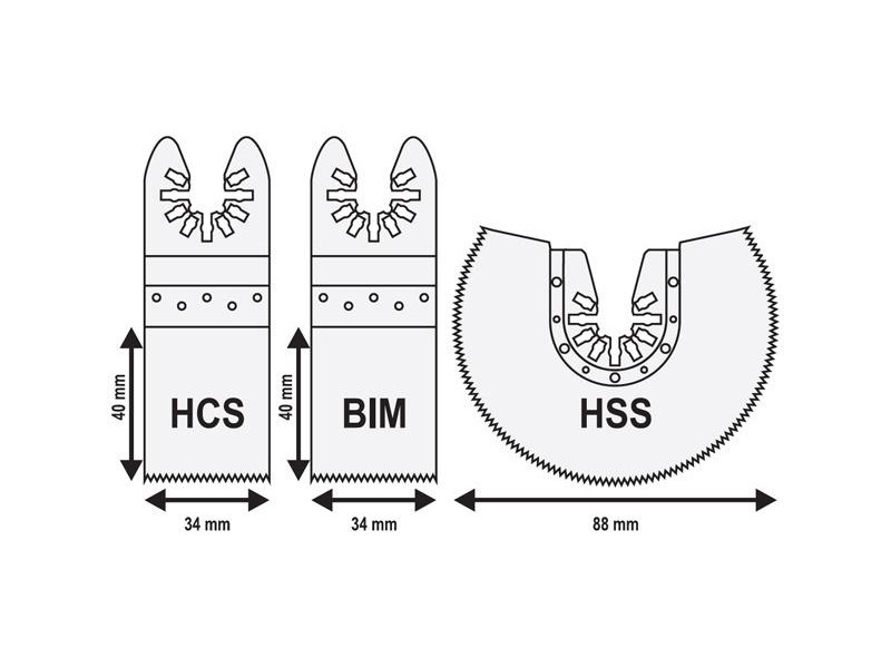 1 HCS merülőlapos fa pengére 34x40mm 1 BIM merülőlapos keményfa/fém pengére 34x40mm 1 HSS kerek keményfa/fém pengére 88mm