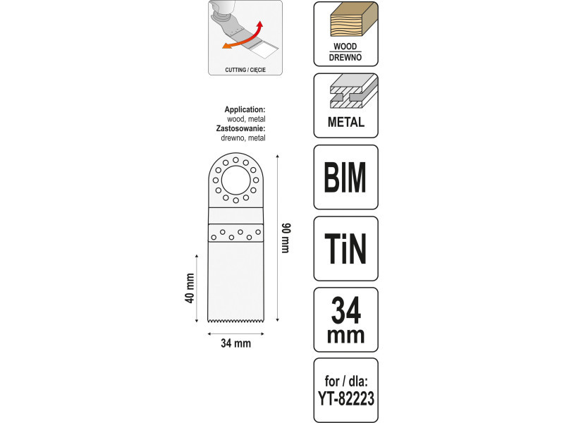 Vágóél fém és a legkeményebb fa vágására. A titánnitrid bevonatnak köszönhetően a fogak nem keményednek meg és gyorsan vág, például az ajtókeret zárjában, acélcsövekben, rézben, fékben és még a betonacélban is.fa és fém vágására tervezveszélesség: 34 mmteljes hossz: 90 mmmunkahossz: 40 mmkialakítva a YT-82223 számára Használati figyelmeztetések: Figyelem! Mindig használjon személyes védőfelszerelést munka közben.