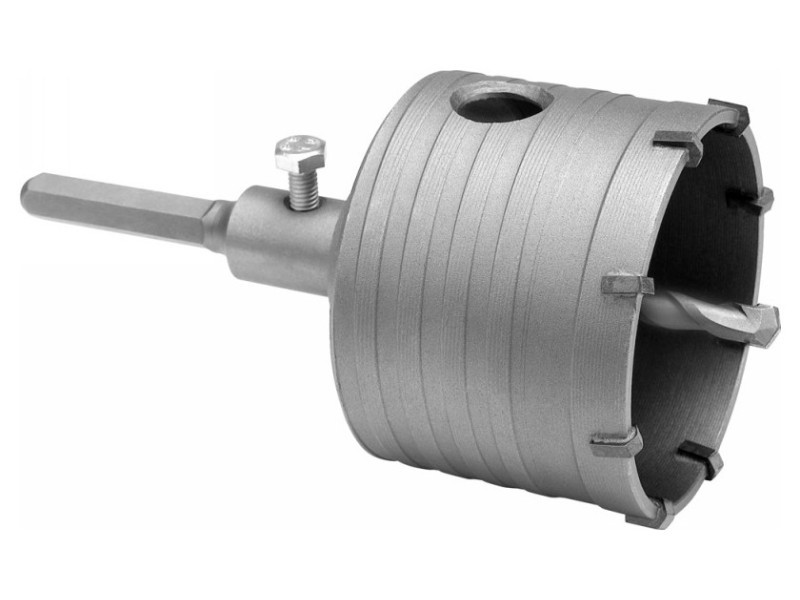 Yato 80 mm-es koronafúró a falakhoz. Az eszköz CR40 ötvözött acélból készült, 8 TCT YT-11C keményfém vágófoggal ellátva. A 50 mm hosszú és 80 mm átmérőjű csipke tökéletes a betonban, téglában, blokkokban, blokkokban való fúráshoz. A Hex 12 mm-es rögzítő tartót egy 16m csavarral rögzítik a fúróhoz. A 6 mm-es irányító fúró és a forgács eltávolítására szolgáló további lyukak használata hatással van a munka minőségére és kényelmére. Tökéletes elektromos dobozok lyukainak fúrásához.