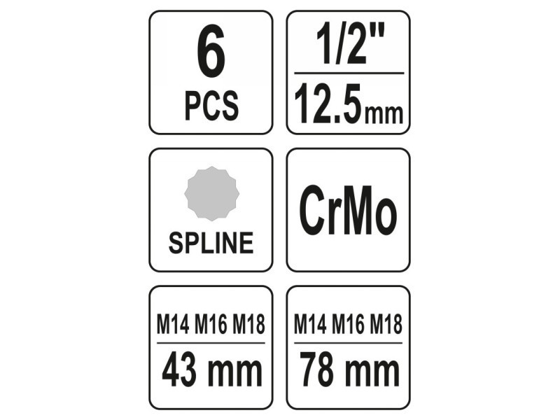YATO Gépi bit dugókulcs készlet 6 részes Spline 1/2" M14-M18 CrMo