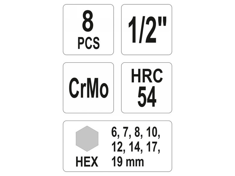 Professionális CrMo SCM-440 ötvözetből készült hatszögletű ütvecs készlet, nagy ellenálló képességgel. A bit végeket különösen a fejek, agyak, tengelyek, hajtóművek vagy váltóművek javítására választottuk ki, többek között. méretek: 6, 7, 8, 10, 12, 14, 17, 19 mm nyél: 1/2” (12.7 mm) Használati figyelmeztetések: Figyelem! Munka közben mindig használjon személyes védőfelszerelést.