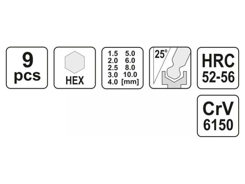YATO YT-0505 hatsó csúcsú Allen kulcskészlet. A készlet egy praktikus műanyag medálon található, amely megkönnyíti a megfelelő méret keresését. A kulcsok kiváló minőségű CRV 6150 króm-vanádium acélból készülnek, amelyeket erősség és rugalmasság jellemez. Az Allys keménysége 52-55 HRC. Kulcsok: 1.5 mm 2.0 mm 2.5 mm 3.0 mm 4.0 mm 5.0 mm 6.0 mm 8.0 mm 10.0 mm Használati figyelmeztetések: Figyelem! Mindig használjon személyes védőfelszerelést a munka során.