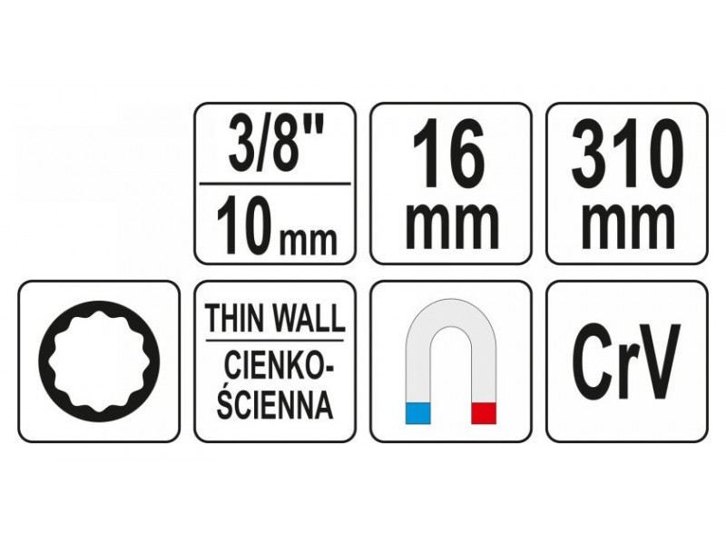Magas minőségű vékonyfalú kulcs hosszabbítóval és könyökkel, gyertyák be- és kiszereléséhez.Erős CrV acélból készültA speciális könyökös kialakítás lehetővé teszi a nehezen hozzáférhető helyek elérését./li>A mágnes segítségével könnyedén kihúzható a gyertya a kicsavarás után12-szögűhossza: 310 mmfogantyú: 3/8"