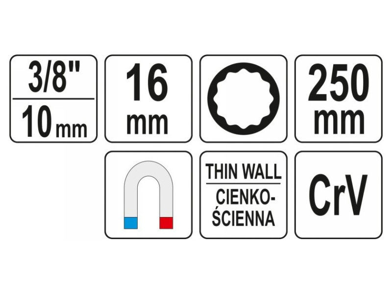 12-szögű gyújtógyertya kulcs szereléshez és eltávolításhoz. Hossza lehetővé teszi a munkát a motorfej szűk helyein. Autószerelő műhelyekben való használatra ajánlott. hossz: 250 mm ellenálló CrV acélból készült mágneses vékonyfalú hajtás: 3/8" átmérő: 16 mm