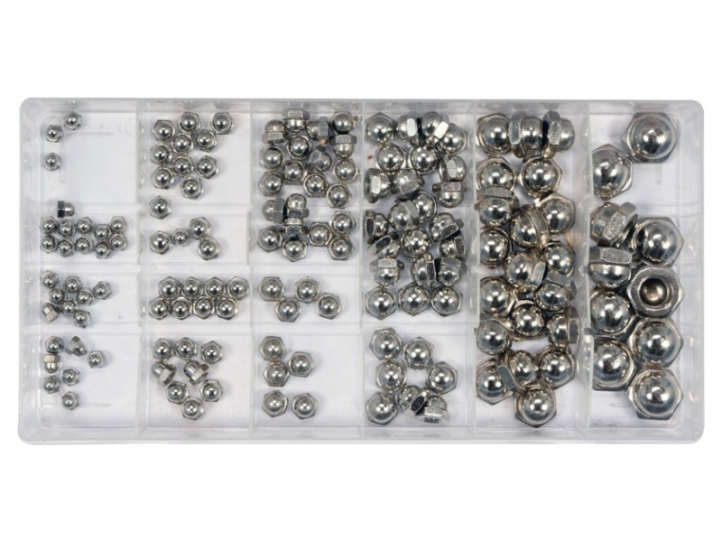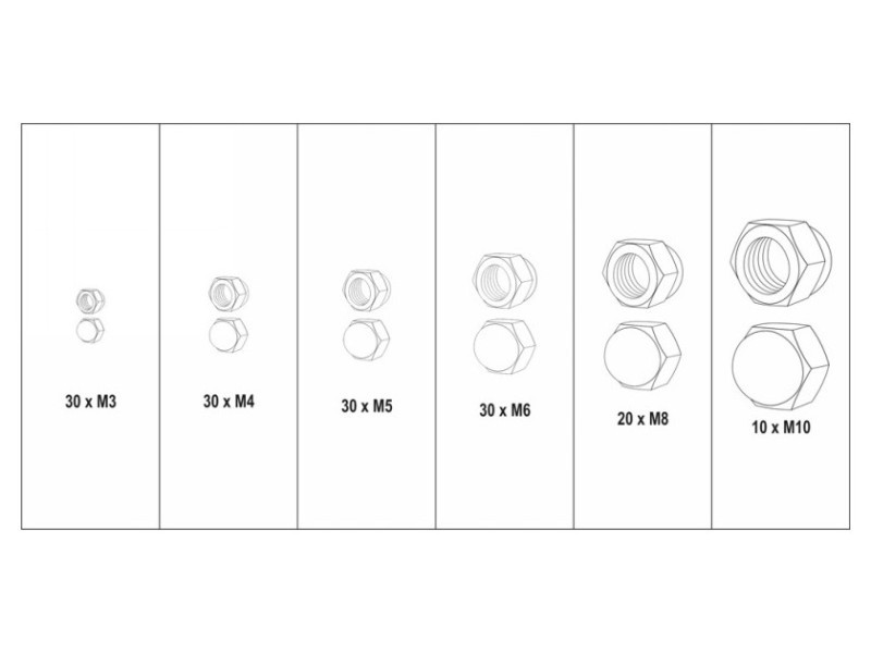 Egy 150 darabos kerékagy/zárt méter készlet. A készlet tartalmazza a következő méreteket: M3, M4, M5, M6, M8, M10. A teljes készlet egy praktikus "szortírozó" csomagolásban található.