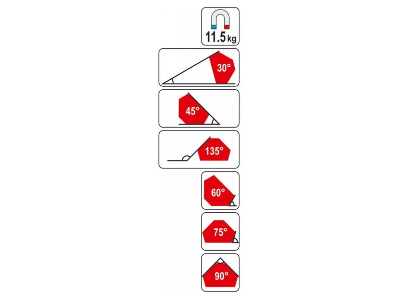 Hegesztő mágneses szögvas 64 x 95 x 14 mm A mágneses ferdelemez acéllemezből és erős ferritmágnesekből készült. Lehetővé teszi a anyagok pontos összeillesztését a következő szögekben: 30°, 45°, 60°, 75°, 90° és 135°. A mágneses szögvas használata lehetővé teszi, hogy szabadon dolgozz mindkét kezeddel, és műveleteket végezhess az egyéb személy segítsége nélkül. További információ: a mágnes terhelhetősége kb. 11,5 kg porfestett felület ideiglenes fém elemek összeillesztésére tervezve hegesztés, fúrás, festés során, tevékenységeknél, amik mindkét kéz használatát igénylik Paraméterek: méret [mm]: 64x95x14 szögértékek [st.]: 30°, 45°, 60°, 75°, 90°, 135° teherbírás [kg]: 11,5 Cél / Alkalmazás: Mágneses munkadarabok előzetes igazítására tervezve, például lemez, szögvas, laposacél, mielőtt véglegesen összeillesztenék őket, például hegesztés, fúrás, szegecselés előtt. Használati figyelmeztetések: Figyelem! Mindig használjon személyes védőfelszerelést a munka során.