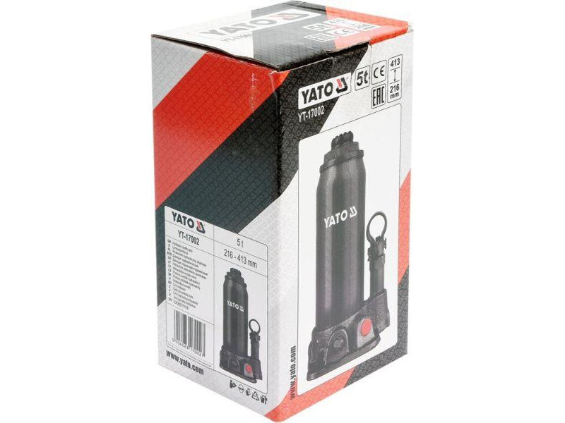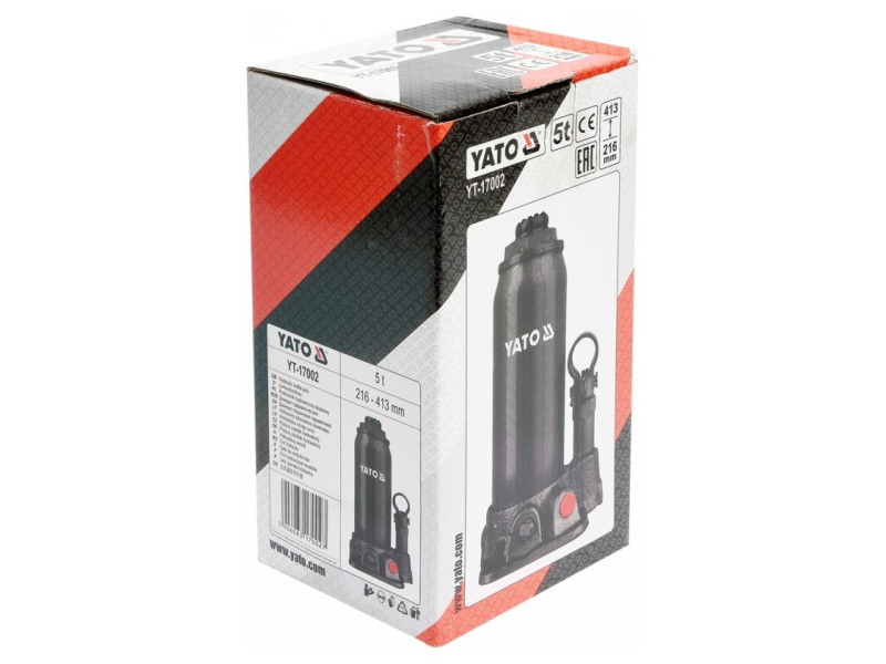 Professzionális YATO márkájú hidraulikus emelő, amely precízen adagolja az olajáramot. Az emelő teherbírása 5 tonna, az emelési tartomány pedig 216 mm-től 413 mm-ig terjed. Kicsi mérete és súlya miatt könnyen mozgatható és tárolható. Elengedhetetlen az autószerelő műhelyekben és járműszerviz állomásokon. Használati figyelmeztetések: Használat előtt alaposan olvassa el az utasításokat. Ne lépje túl az emelő teherbírását. Az emelőt stabil, egyenletes és szilárd felületre kell helyezni. Ne végezzen tevékenységet egy emelt és nem rögzített jármű alatt. Ne állítsa be a biztonsági szelepet.