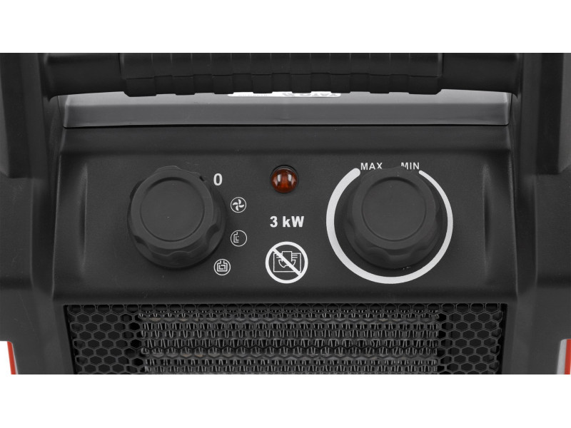 Hordozható PTC elektromos fűtőtest műanyag házban. Szobák, műhelyek, csarnokok fűtésére és felújítási, építési munkák során történő szárításra használják. A felhasználó három üzemmódot állíthat be a berendezésen: ventilátor működtetése a fűtőtest nélkül, a fűtőtest félerőteljes működése és teljes teljesítményű működése. A fűtőtestnek dupla túlmelegedés elleni védelme van és automatikusan kikapcsol, ha felborul. hőteljesítmény: 3000 W fűtési terület: 30 m2 légszállítás: 322 m3/h teljesítménybeállítások: 7/2000/3000 W súly: 1.46 kg bemeneti védelmi osztály: IP20 termosztát: 65 °C méretek: 234x130x284 mm kábel hossza: 1.3 m feszültség: 220-240V/50Hz