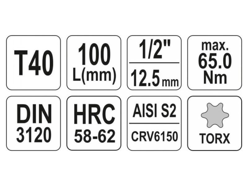 Professzionális Torx csavarhúzó, 1/2"-os fejméret, T40-es méret. Króm alakú fej, CRV6150 acélból készült, aisi S2 acél szárral, és nikkel bevonattal. Nélkülözhetetlen eszköz autó- vagy gépjavító műhelyben.