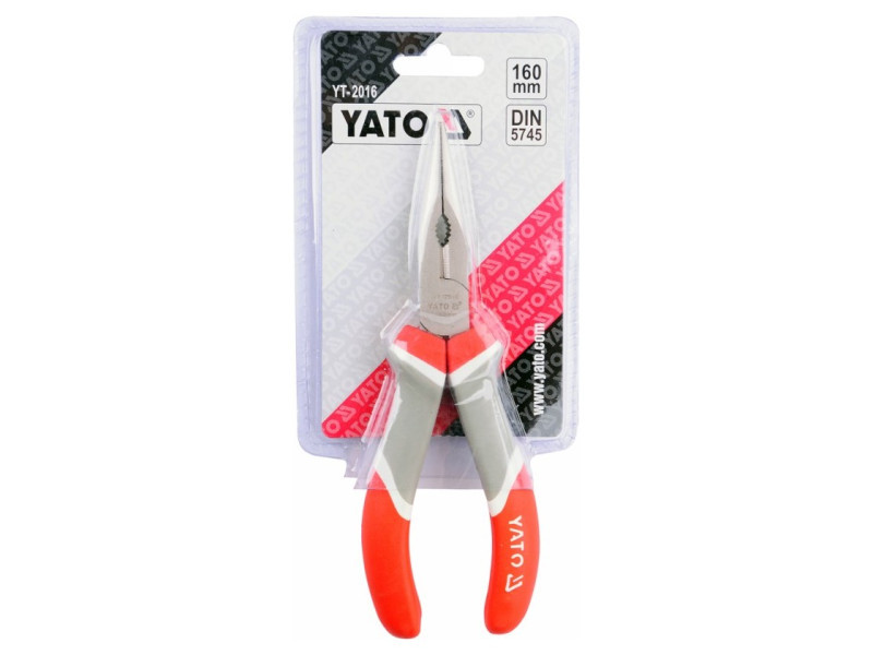 Egyenes hosszított fogók 160 mm hosszúsággal a YATO-tól. A fogantyúkat kényelmes műanyag háromkomponensű betétekkel borították.