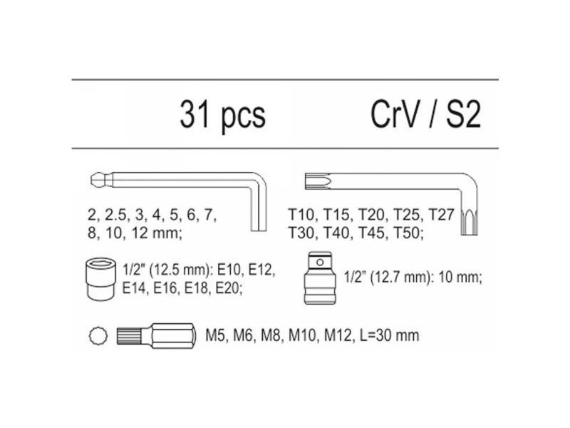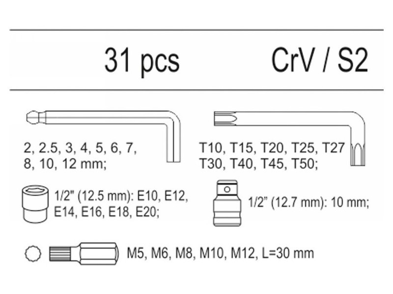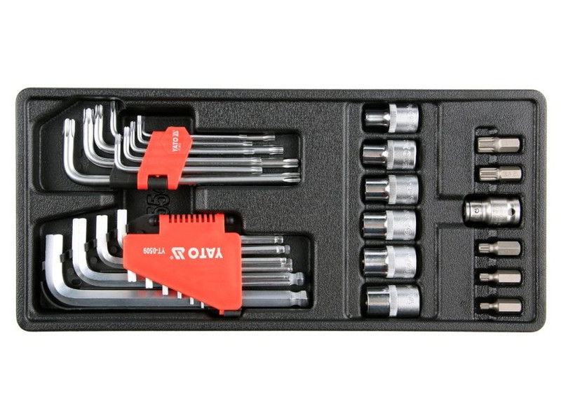 Fiókbetét 31 elemmel. A készletben golyós inbuszkulcsok, Torx inbuszkulcsok, fejek és bitek találhatók. - betét - lakkozott végű HEX inbuszkulcs - 2 mm-től 12 mm-ig - TORX inbuszkulcs T10 T15 T20 T25 T27 T27 T45 T45 T50 - Torx 1/2 "E10, E12, E14, E16, E18, E20 - SPLine csavarhúzó M5, M6, M8, M10, M12 - 1/2 "fej