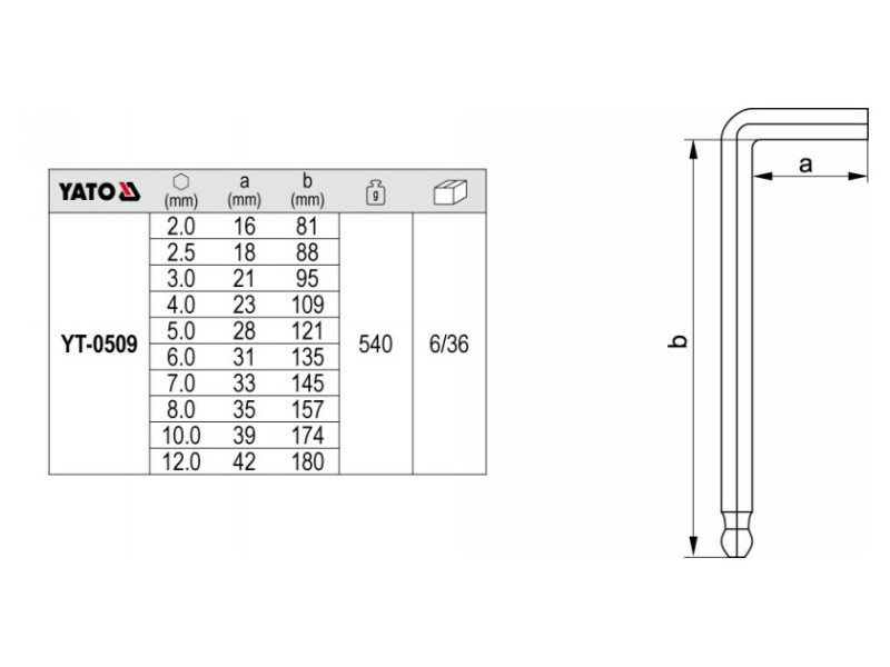 YATO Imbuszkulcs készlet 10 részes 2,0-12 mm CrV