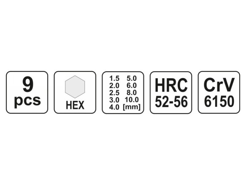 Professzionális imbuszkulcs készlet hexa csúccsal. A készlet egy praktikus és kézreálló műanyag medálon van csomagolva, ami megkönnyíti a megfelelő méretű kulcs megtalálását. A kulcsok kiváló minőségű CRV 6150 vanádium acélból készültek, amelyek erősségük és rugalmasságuk miatt kitűnnek. Az imbuszkulcsok keménysége 52-55 HRC. Használati figyelmeztetések: Figyelem! Mindig használjon személyes védőfelszerelést munka közben.
