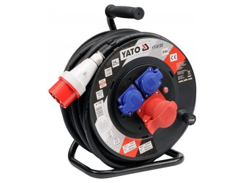 Építkezési és műhely hosszabbító kábel YT-8120 hossza 25 méter, 2 db ~230V névleges feszültségű aljzattal, gyerekvédelemmel és egy db ~400V névleges feszültségű aljzattal. A tápkábel egy 5-tűs csatlakozó ~400V névleges feszültségre. Hővédelemmel ellátott hosszabbító kábel. A neoprén gumi bevonatú kábel, amely strapabíró műanyag dobba van tekerve, lehetővé teszi a hosszabbító kábel beltéri és kültéri használatát is, például építkezéseken, kertekben, gyárak előtti udvarokon.
