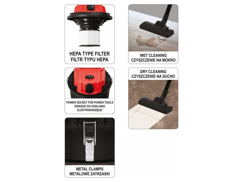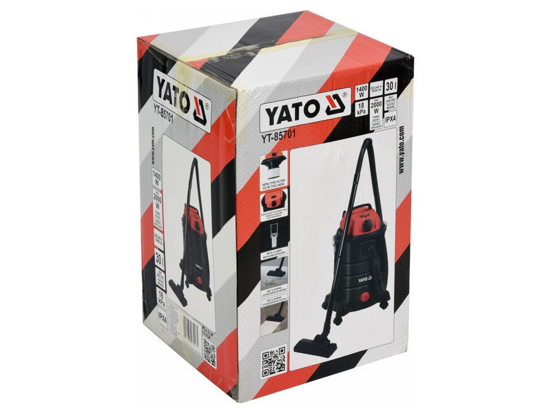 YATO műhelyporszívó 1400W teljesítménnyel és 18 kPa szívóerővel. A porszívó tartálya 30 L kapacitású. A porszívó rendelkezik egy teleszkópos, antistatikus csővel. Továbbá beépített csatlakozóval rendelkezik, amely lehetővé teszi a szerszámgépek működtetését. Nedves és száraz munkavégzésre alkalmas. Levegőfúvóként is használható. Jellemzők: 1400W teljesítmény szívóerő 18 kPa kapacitás 30 L magas szívóerő és teljesítmény hosszú üzemidő érdekében kétlépcsős teljesítményszabályozás nedves és száraz használat HEPA filter a motor hosszabb élettartamáért teleszkópos, antistatikus cső csatlakozó szerszámgépekhez automatikus indítás funkcióval levegőfúvó funkció, amely hasznos a faipari eszközök pormentesítéséhez, a nehezen hozzáférhető helyek tisztításához fém ház és rögzítőelemek zsák használatával vagy anélkül használható 5 m kábel