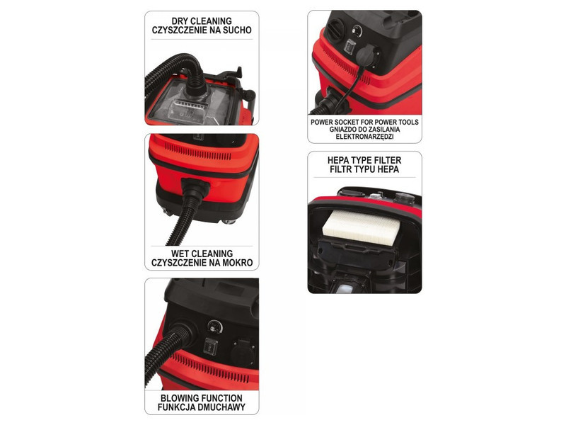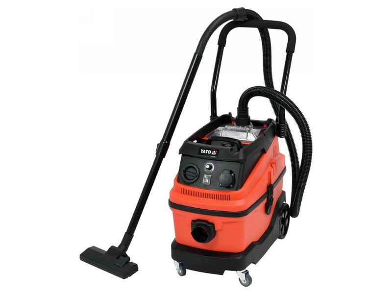 YATO professzionális ipari porszívó, 1600W teljesítménnyel és 18 kPa szívóerővel. A porszívó 30 L-es tartállyal rendelkezik. A porszívó nedves és száraz működésre is alkalmas. Fúvó funkcióval is felszerelt. Építkezéseken, asztalosműhelyekben és festőüzemekben használatra tervezve. Megfelel a legtökéletesebb szabványoknak a finom szennyeződések, mint a gipsz és a keményfa (tölgy, kőris) por eltávolításában. Jellemzők: 1600W teljesítmény hosszantartó működéshez 30 L tartály többlépcsős szűrőrendszer fokozatmentes teljesítmény-szabályozás nedves és száraz alkalmazás áramforrás dugalj automatikus indítás funkcióval rendelkező elektromos szerszámokhoz levegőfúvó funkció, amely hasznos a faipari szerszámok portól való megtisztításához, nehezen elérhető helyekről történő szennyeződés eltávolításához kézi szűrőrázó (gomb) zsák használata nélkül is használható 5 m kábel újrahasználható textilzsák tartozék