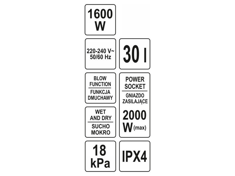 YATO professzionális ipari porszívó, 1600W teljesítménnyel és 18 kPa szívóerővel. A porszívó 30 L-es tartállyal rendelkezik. A porszívó nedves és száraz működésre is alkalmas. Fúvó funkcióval is felszerelt.