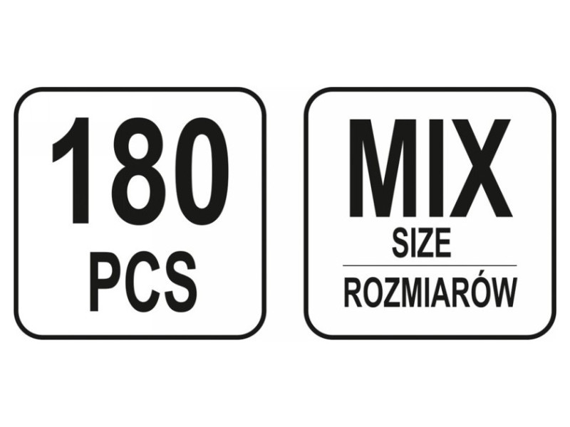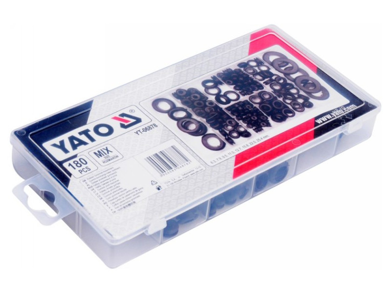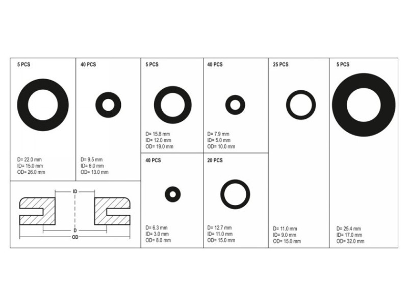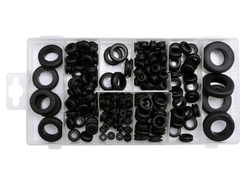 A gumitömítő készlet 180 darabot tartalmaz, különböző méretben. Az egészet egy kényelmes "válogató" típusú csomagolásban helyeztük el.