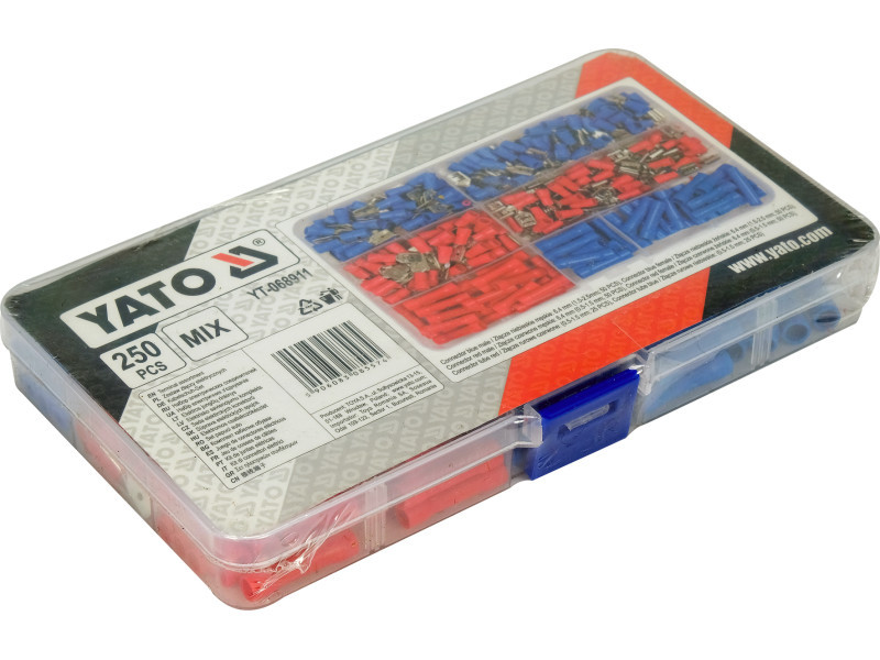 Univerzális elektromos csatlakozó készlet elektromos szerelők és mechanikusok számára autók, teherautók és építőipari gépek esetén. Kényelmes tokban csomagolva tartalmaz 250 alkatrészt: kék apa csatlakozó: 6.4mm (1.5-2.5mm) 50 db. kék anya csatlakozó: 6.4mm (1.5-2.5mm) 50 db. piros apa csatlakozó: 6.4mm (0.5-1.5mm) 50 db. piros anya csatlakozó: 6.4 mm (0.5-1.5 mm) 50 db. piros cső csatlakozó: (0.5-1.5 mm) 25 db. kék cső csatlakozó : (0.5-1.5 mm) 25 db.