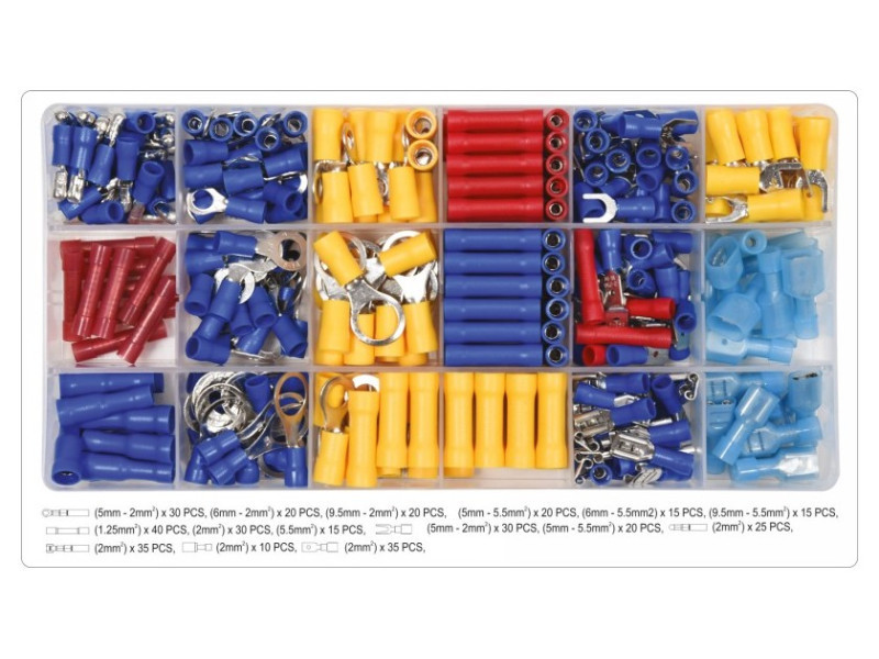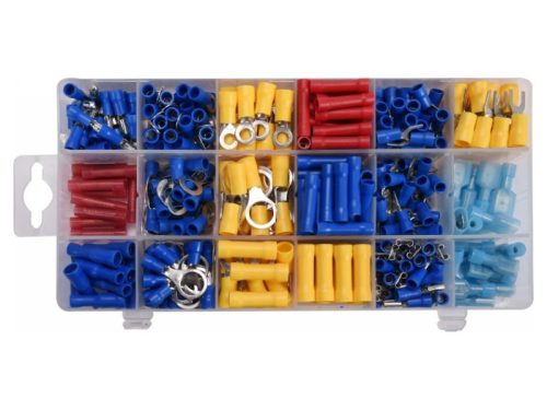 Univerzális készlet elektromos csatlakozókból és dugókból, amelyek használhatók elektromos szerelőknek és autószerelőknek egyaránt, autókon, teherautókon és építőipari gépeken.kényelmes dobozban csomagolvaA készlet tartalma:30 x (5 mm – 2 mm2)20 x (6 mm – 2 mm2)20 x (9.5 mm – 2 mm2)20 x (5 mm – 5.5 mm2),15 x (6 mm – 5.5 mm2)15 x (9.5 mm – 5.5 mm2)40 x 1.25 mm230 x 2 mm215 x 5.5 mm2,30 x (5 mm – 2 mm2)20 x (5 mm – 5.5 mm2)25 x 2 mm235 x 2 mm210 x 2 mm235 x 2 mm2