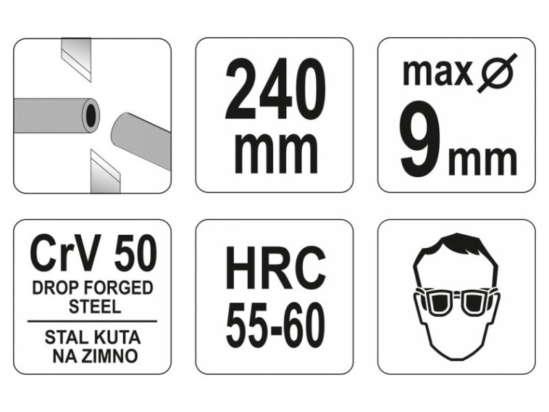 Drótvágó fogó YT-1969 hidegen kovácsolt, két komponensű fogantyú sapkával.vágó állkapcsok CrV50 kovácsolt acélból, HRC 55-60 keménységre edzvemegkeményített test HRC 42-48-ravágja a drótokat: legfeljebb 9 mm-ig