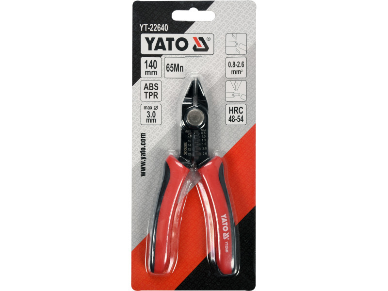 Szigetelés lehúzó vágóYT-22640 kiváló minőségű, edzett rugóacélból készült két-komponensű fogantyú sapkákkal. Az eszköz teste szilárdan beágyazva van tartós ABS-ből készült borításokba, amelyek továbbá rendelkeznek egy csúszásmentes és kellemes tapintású TPR anyaggal.  A vágó kétségtelen előnye a nagy és szilárd összekötő szegecs, amely minimalizálja a vágó él oldalirányú terjedését, így a vágó precíz és ismételhető.Test és vágó állkapocs kiváló minőségű 65Mn rugóacélból készült, ami HRC 48-54-re van edzveakár 3 mm átmérőjű vezetékek vágásaszigetelés eltávolítása a vezetékekről: 0,8 - 2,6 mm2két-komponensű fogantyú ABS-ből és TPR-ből készült Használati figyelmeztetések: Figyelem! Mindig használjon személyes védőfelszerelést a munka során.