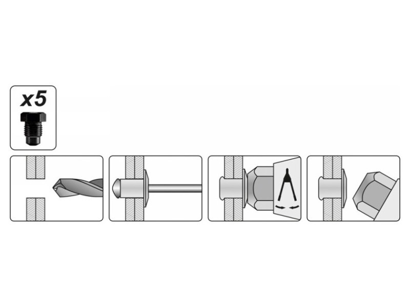 Kézi szegecselő gép, melyet acél szegecseléshez, rozsdamentes acél szegecseléshez és alumínium szegecseléshez terveztek. Jellemzők: rövid kar dupla zsanérokkal a tőkeerő növelésére háromrészes Cr-Mo acél állkapocs, hosszú élettartamot biztosít. Az egy darabos gyűrű fedél lehetővé teszi a szegecs átmérőjének cseréjét a szerszám beállítása nélkül a levágott szegecs szár gyűjtője egyszerű és biztonságos hulladékgyűjtést biztosít ideális nehezen hozzáférhető területeken végzett munkákhoz ergonomikus fogantyúk kényelmes munkavégzést biztosítanak. Specifikáció: 5 fej: 3.2 mm (1/8"); 4.0 mm (5/32"); 4.8 mm (3/16"); 6.0 mm (7/32"); 6.4 mm (1/4") Hossz: 330 mm Súly: 1.14 kg Használati figyelmeztetések: Figyelem! Mindig használjon személyes védőfelszerelést munka közben.