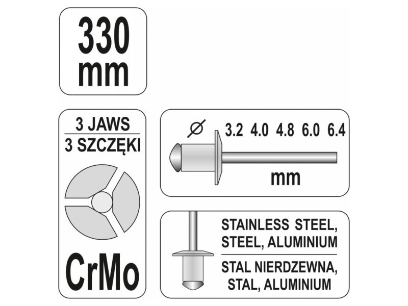 YATO Karos popszegecsfogó CrMo pofa 330 mm (3,2-6,4 mm)