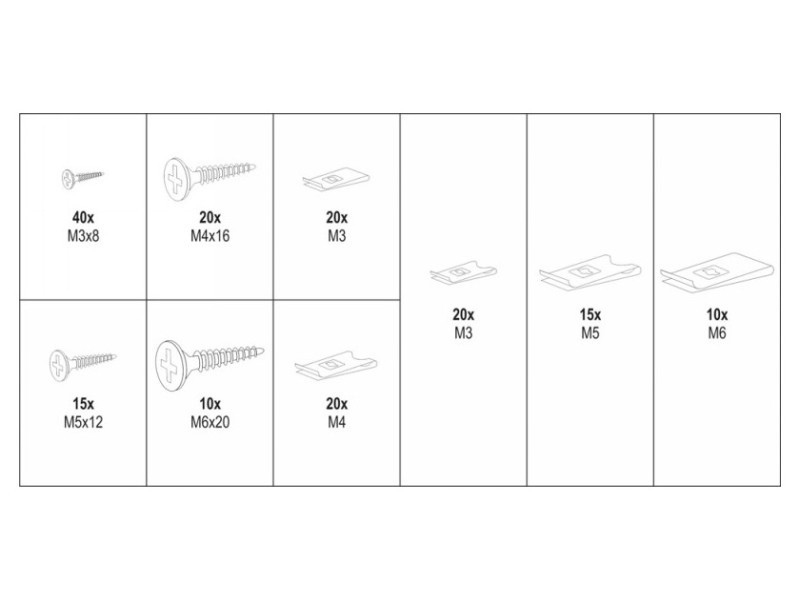 Egy 170 darabos csavarok és testbetétek készlet. A készlet M3x8 mm-től M6x20 mm-ig csavarokat és betéteket tartalmaz. Az egészet egy praktikus "osztó" csomagolásban helyeztük el.