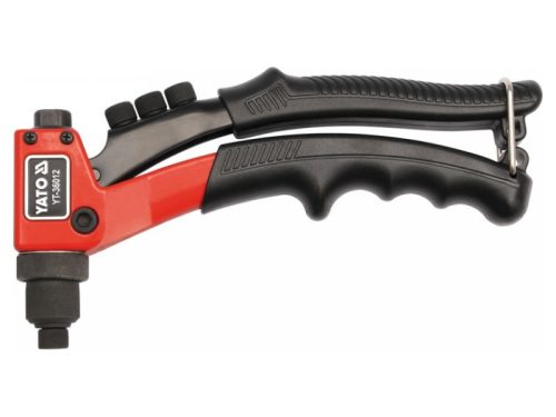 Yato márkájú kézi szegecselő  2.4; 3.2; 4.0; 4.8 mm átmérőjű szegecsekhez az alapanyag öntött alumínium széntartalmú acélból készült fogantyú./li> szétcsúszó mechanizmus - három CrMo króm-molibdén ötvözetű acélból készült állkapocs ennek a szegecselőnek a különlegessége a rendkívül rövid, kb. 200 mm-es hossza, amely lehetővé teszi a szegecselőgép nehezen hozzáférhető helyeken történő használatát   Főként gépészeti és légkondicionáló szervizeléshez ajánlott. Használati figyelmeztetések: Figyelem! Mindig használjon személyes védőfelszerelést munka közben.
