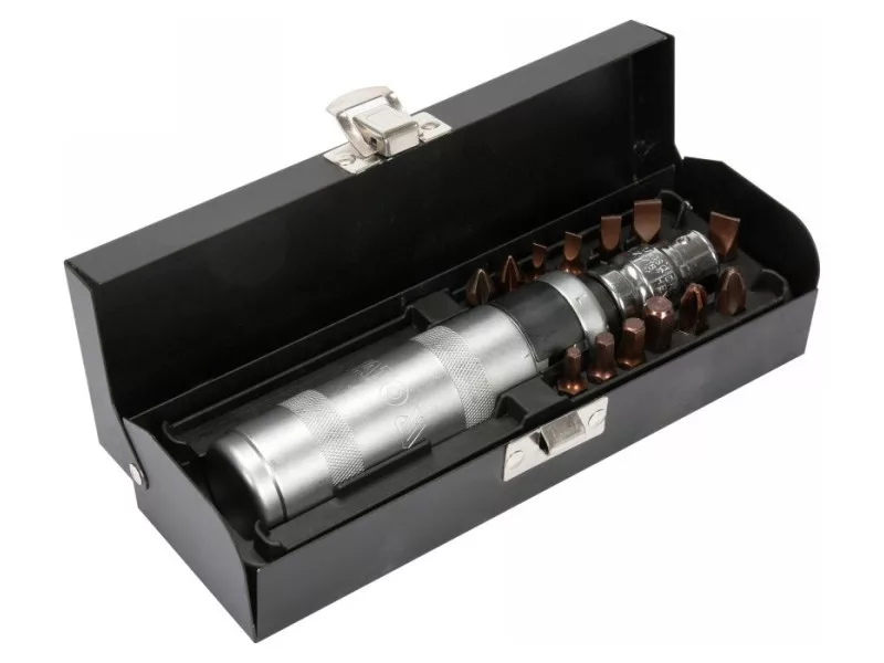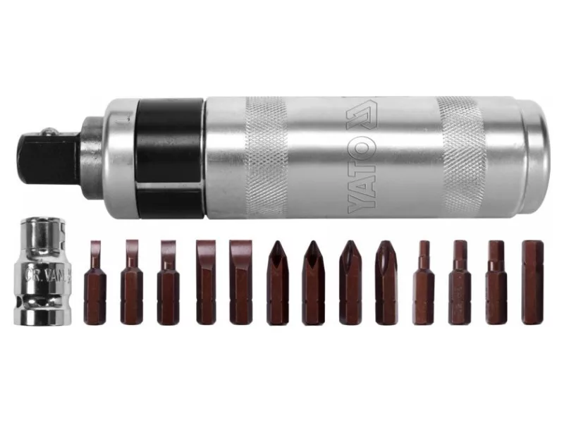 160mm hosszú ütvefúró csavarhúzó 13 fekete YATO YT-28015 hegyekkel. A csavarhúzó strapabíró CRV acélból készült, ellenáll a deformációnak, amikor kalapáccsal ütnek rá, míg a hegyek kiváló minőségű S2 acélból készülnek.