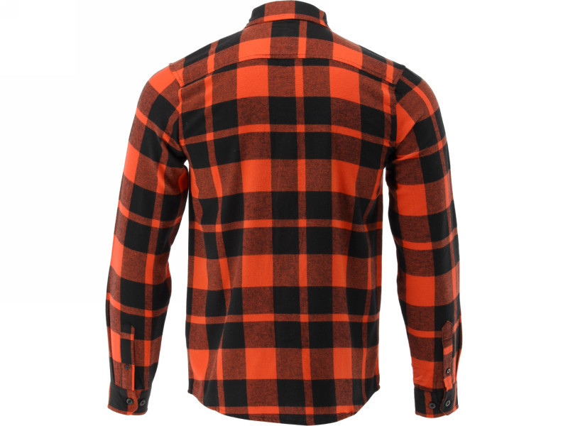 Kockás mintás flanel ing, két mellzsebbel, 100% pamutból, 170 g/m2 súllyal. A ráncmentes drapírozott anyag nem okoz irritációt, rendkívül kellemes tapintású, tökéletesen lélegzik, jobb hőtulajdonságokkal rendelkezik, mint a hasonló súlyú hagyományos póló. A varrási technikák és a szabás úgy lettek kiválasztva, hogy hangsúlyozzák az ing könnyedségét a bőrbarát drapírozott anyaggal. Azokon a területeken, amelyek nem hajlamosak a szakadásra, de hátrányosan befolyásolhatják a szabás merevségét, egyszerű varrást alkalmaztak. Dupla varrást használtak ott, ahol a szakadás veszélye áll fenn, és ahol az anyag a legnagyobb igénybevételnek van kitéve a mozgásunkkal. A hosszú anyagszövetek megbízható overlock varrással készültek.