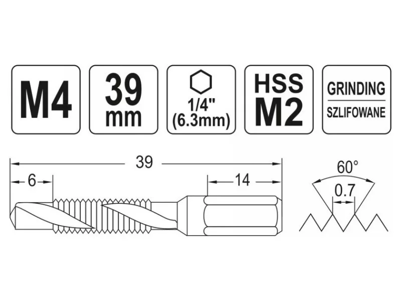 Yato YT-44841 fúró-csapkészítő. Páratlan metrikus menetek készítéséhez tervezve. Gépi és kézi menetfúráshoz használható. HSS M2 magas minőségű, gyorsacélból készült csiszolt felület biztosítja a kiváló pontosságot és gyorsabb fúrási sebességet tartós és ellenáll a károsodásnak és a lekopásnak önközpontosító fúrófejek kiváló forgácseltávolítás 1/4" HEX tokmány Paraméterek: anyag: HSS M2 méret: M4 menetemelkedés [mm]: 0.7 Használati óvintézkedések: Figyelem! Mindig használjon személyes védőfelszerelést munka közben.