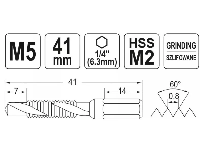Yato YT-44842 furat-csap menetfúró. Pontos metrikus menetek vágására tervezve. Gépi és kézi menetvágásra használható. kiváló minőségű HSS M2 gyorsacélból készült csiszolt felülete kiváló pontosságot és gyorsabb fúrási sebességet biztosít tartós és ellenálló a károsodásokkal és tompulással szemben önközpontosító fúrófejek kiváló forgácseltávolítás 1/4" HEX tokmány Paraméterek: anyag: HSS M2 méret: M5 menetemelkedék [mm]: 0.8 Használati figyelmeztetések: Figyelem! Mindig használjon személyes védőfelszerelést munka közben.